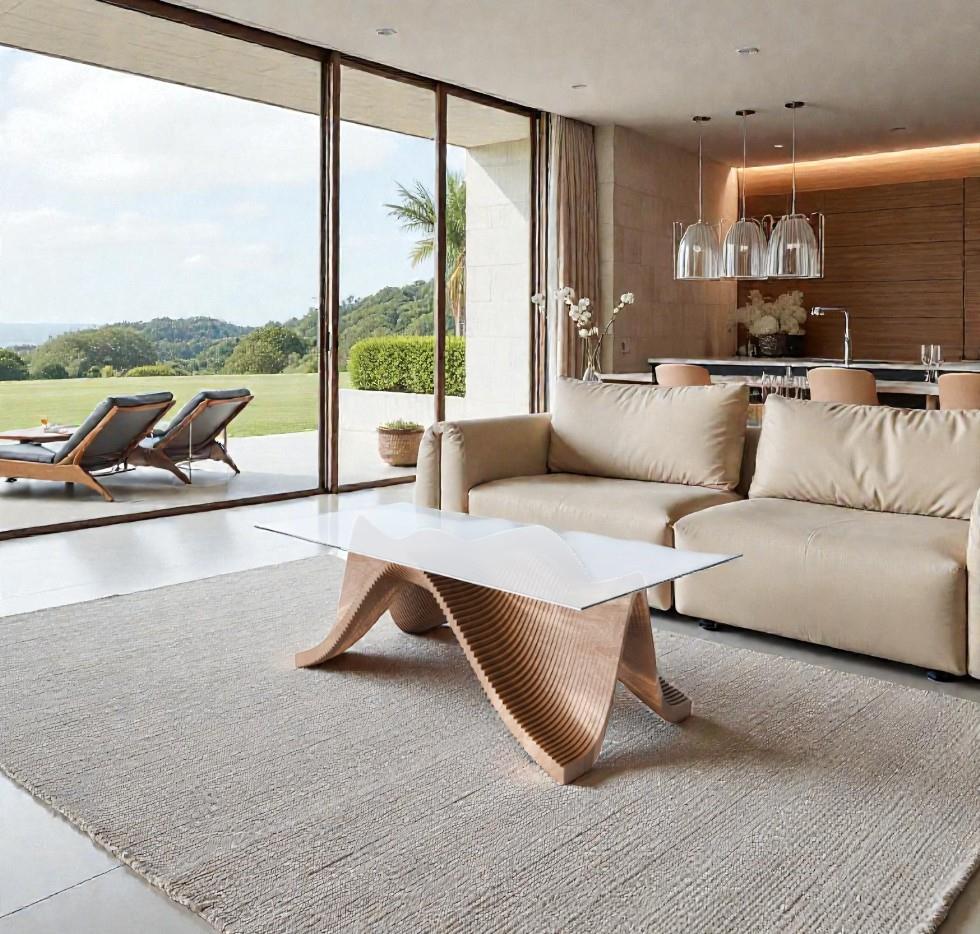 Üstünde yer alan cam yüzey, hafifliği ve modernliği temsil ederken; altındaki parametrik ahşap form, doğanın akışkan çizgilerini sanatsal bir dille yorumlar.